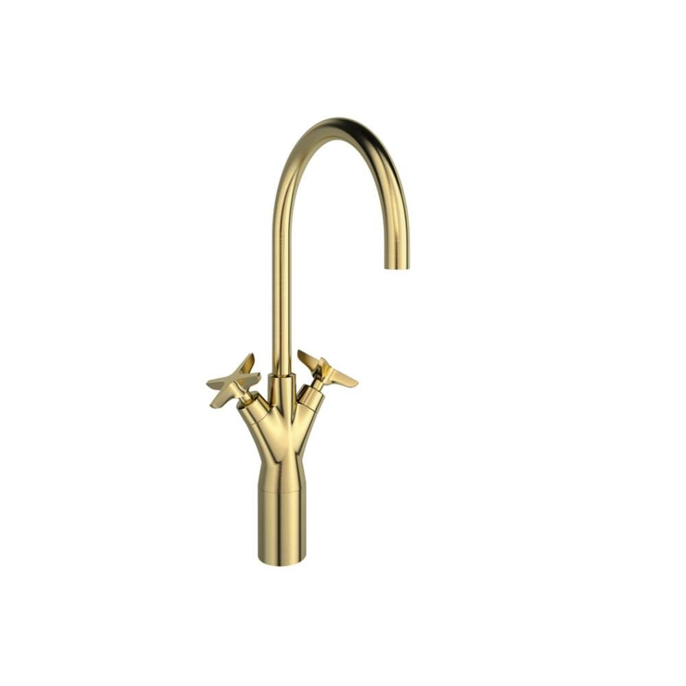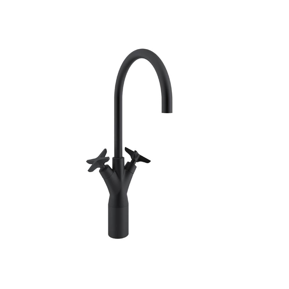 Grifo de lavabo alto bimando con maneta en forma de aspa, caño 190mm y giratorio 360º. Con sistema anticorrosión patentado. Acabado: Cromo, Negro Mate y Oro Cepillado.