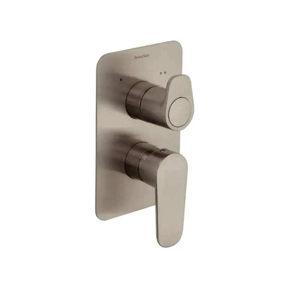 Grifo de bañera empotrado 2 vías con placa metálica extraplana, de instalación sencilla por su cuerpo compacto, sistema S2 de ahorro de agua del 50% y limitador de temperatura. Acabado en: Cromo, Negro Mate, Níquel Cepillado y Oro Cepillado.