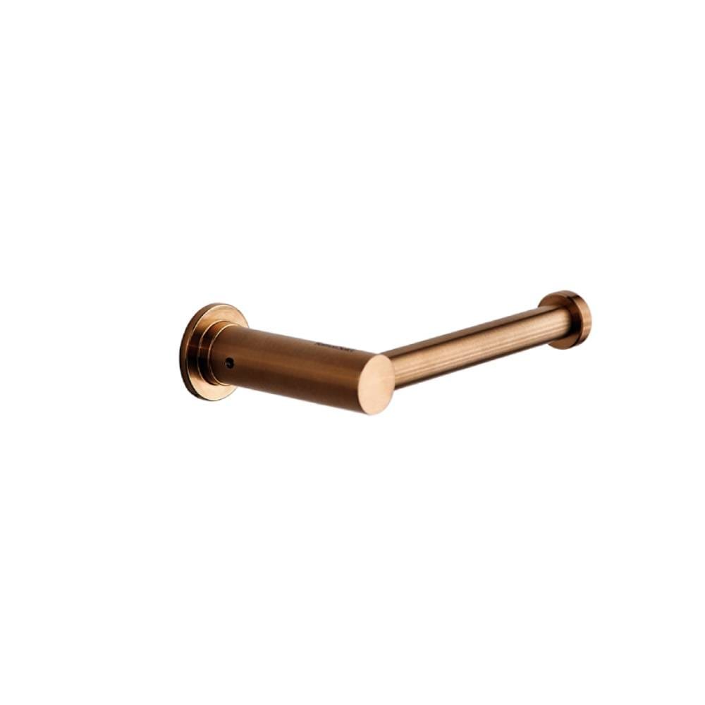 Portarrollos de pared para baño de diseño minimalista. Con sistema de instalación dual: fijación mecánica de tornillos a pared y/o fijación adhesiva con pegamento Sealant Fix. Acabado: Cobre Cepillado, Cromo, Negro Mate, Níquel Cepillado y Oro Cepillado.