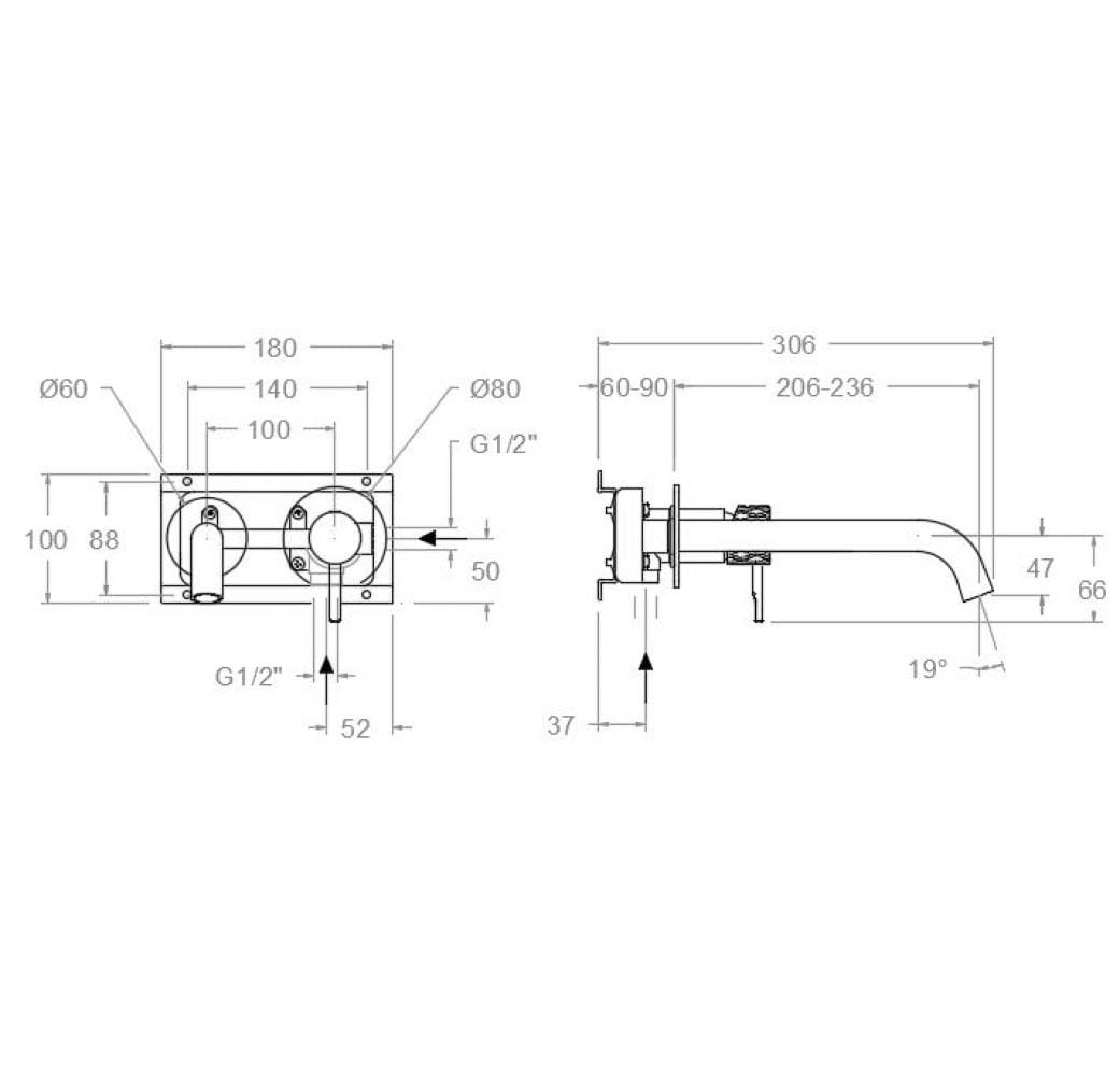 Grifo de lavabo empotrado mural con caño de 240 mm, sistema S2 de ahorro de agua del 50%,limitador de temperatura y sistema anticorrosión patentado. Acabado: Cobre Cepillado, Cromo y Oro Cepillado.