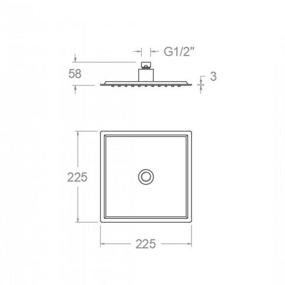 Rociador de ducha ABS de forma, cuadrada de 225 mm y, con un mínimo grosor ultraslim de 2 mm, de máxima durabilidad, limitador de caudal y sistema anti-cal gracias a sus boquillas flexibles de silicona. Acabado: Cromo y Negro Mate.