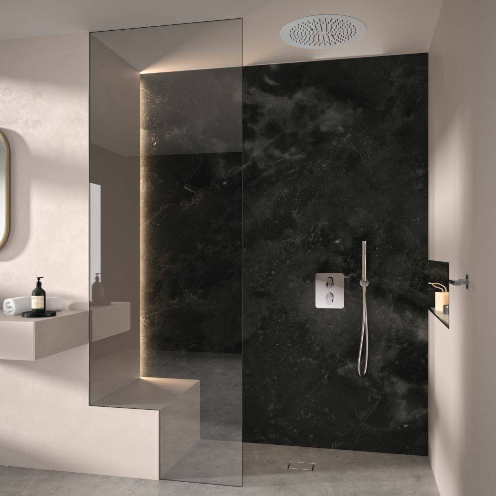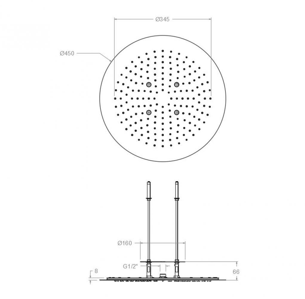 Rociador empotrado redondo de Ø450 mm de 1 vía. Antical. Acabado: Cobre Cepillado, Cromo, Negro Mate y Oro Cepillado.