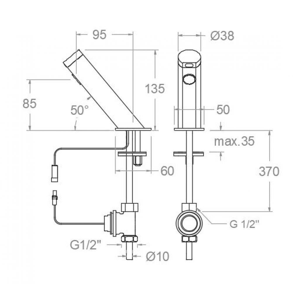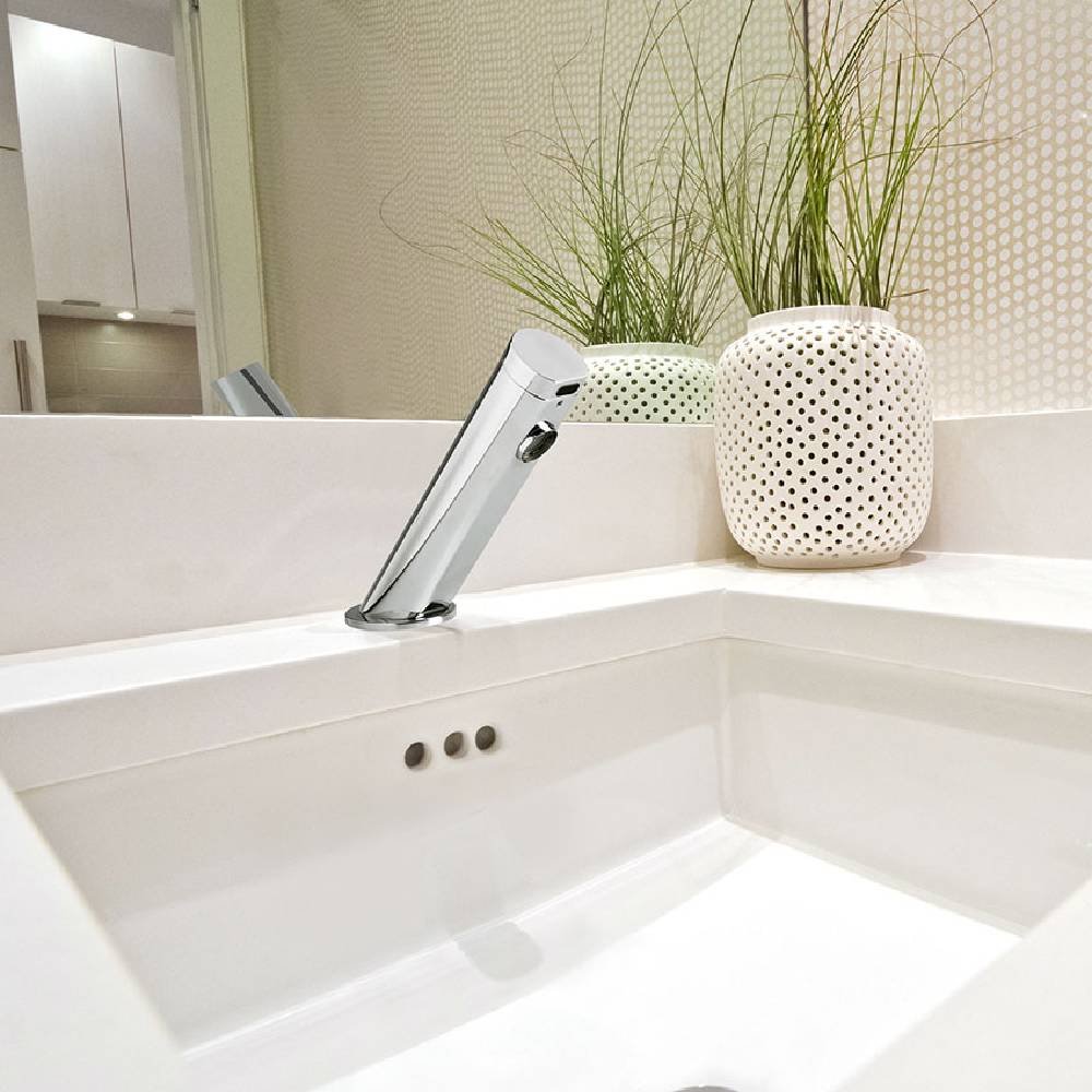 Grifo contactless para lavabo inclinado de un agua o premezclada, con batería alcalina de 9V, descarga automática anti-legionela cada 24h, distancia de detención 10cm, caudal 6 l/min, temperatura máxima 65ºC, presión recomendada 3 bar y cromado de alta resistencia Diamond Finish. Acabado: Cromo.